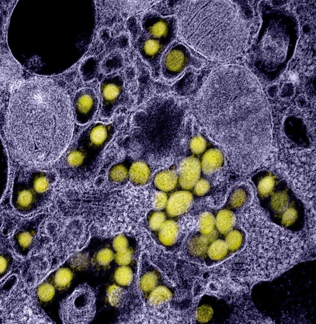 1.1 | Microscopy image of SARS-CoV-2 viruses. Electron microscopy can magnify images up to 50 million times, providing incredibly detailed images of even the tiniest structures; here in yellow, we can see viral particles of the SARS-CoV-2 virus. Electron micrographs are typically black and white, but the image was digitally enhanced to show color and differentiate the viral particles from cell organelles. Image credit: NIAID Integrated Research Facility (IRF) in Fort Detrick, Maryland.