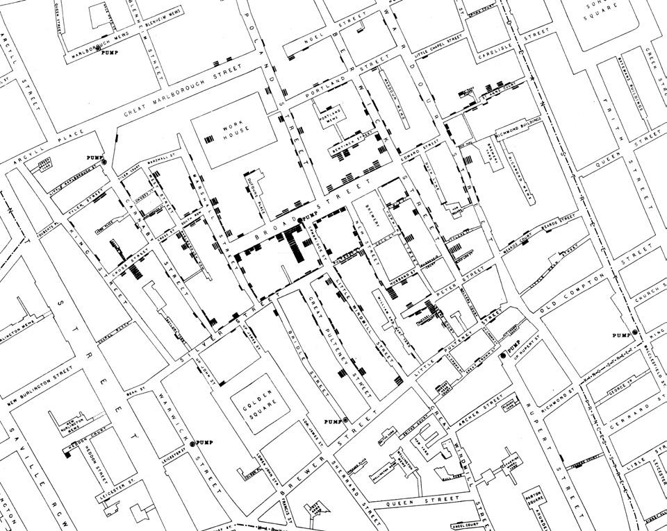 You decide to get to the bottom of this. You travel around the neighborhood for the next few days, asking the local shopkeepers if they know anyone who has been infected. It doesn’t take long before the shop owners fill your list with names, and you begin to investigate how these individuals’ paths may have crossed. You decide to sketch a ‘dot map’ of Golden Square, a classic tool used to identify affected households on maps and mark the locations of the infected households. A pattern emerges from within the data – clusters of infected households have amassed in certain parts of the neighborhood.