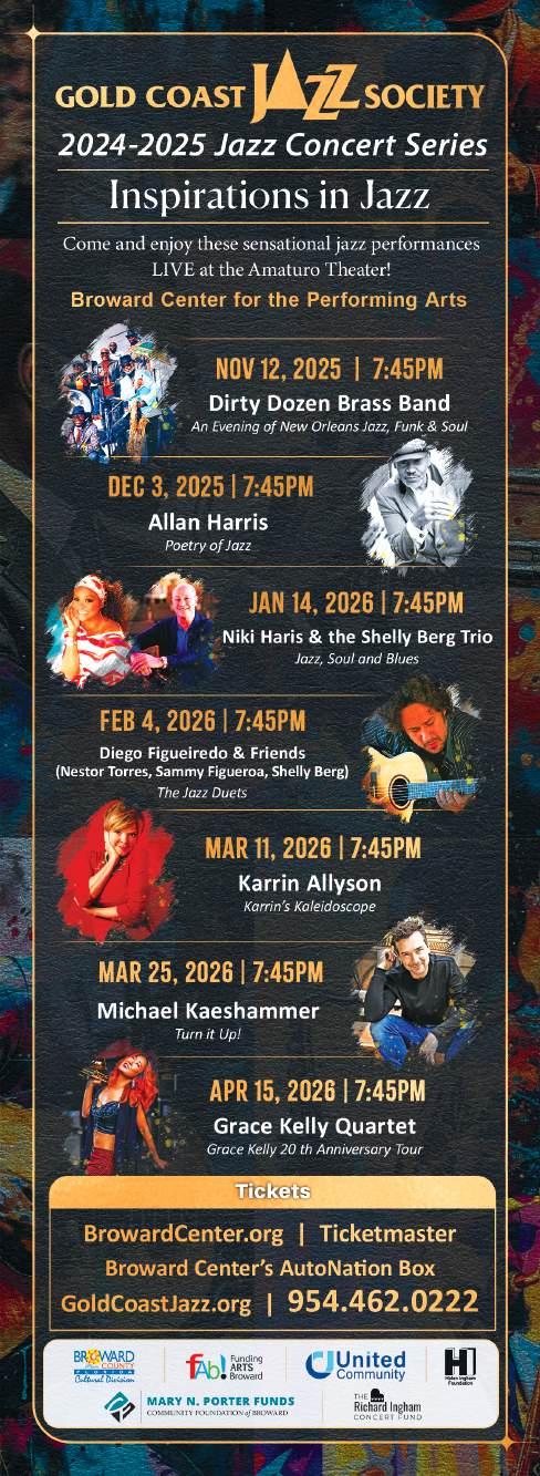 Season 16 is presented with generous support from key partners, including the Broward County Cultural Division, Community Foundation of Broward, Seminole Hard Rock Hotel & Casino Hollywood, The Warten Foundation, The Our Fund Foundation, and CAN Community Health, all sharing a commitment to diversity, arts, and inclusion.