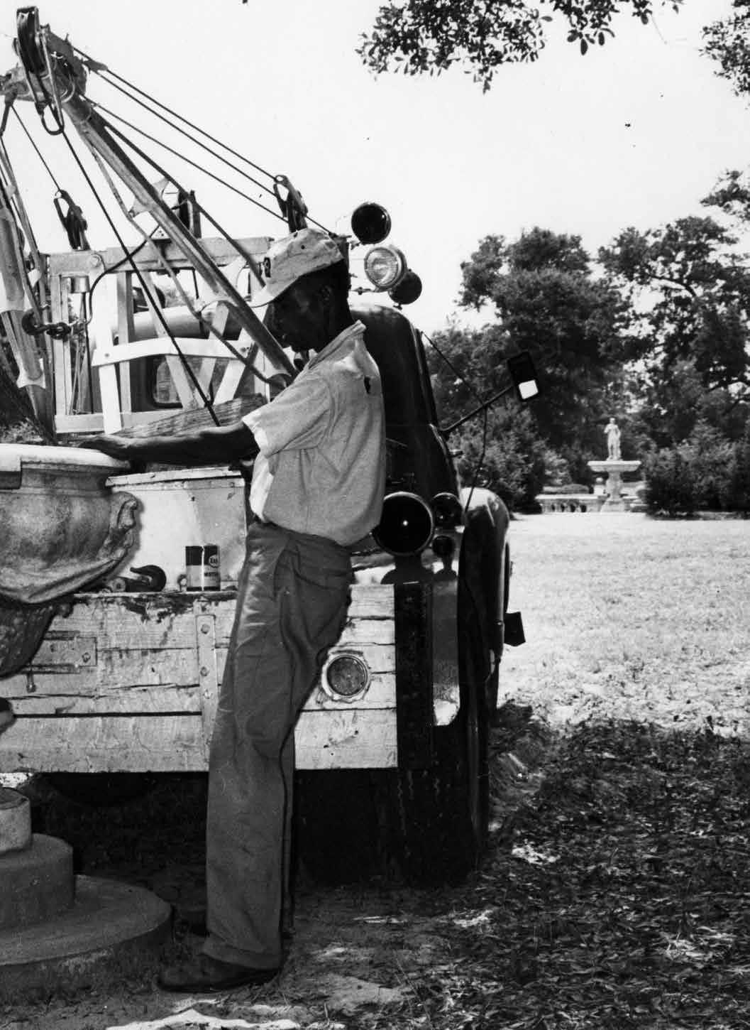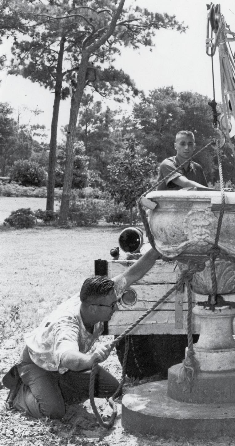 Heavy lifting, circa ’54. Louis Midgette and Ed Whitaker (front) and Buddy Jolliff give this 16th century lion couchant a permanent home — with some mechanical help. “It took a dump truck nine trips to carry all the statues here from Georgia,” says Buford. “Then RD Sawyer’s family loaned Mr. Midgette a wrecking truck to place them all in the perfect spot.” Photo: Elizabethan Gardens Collection