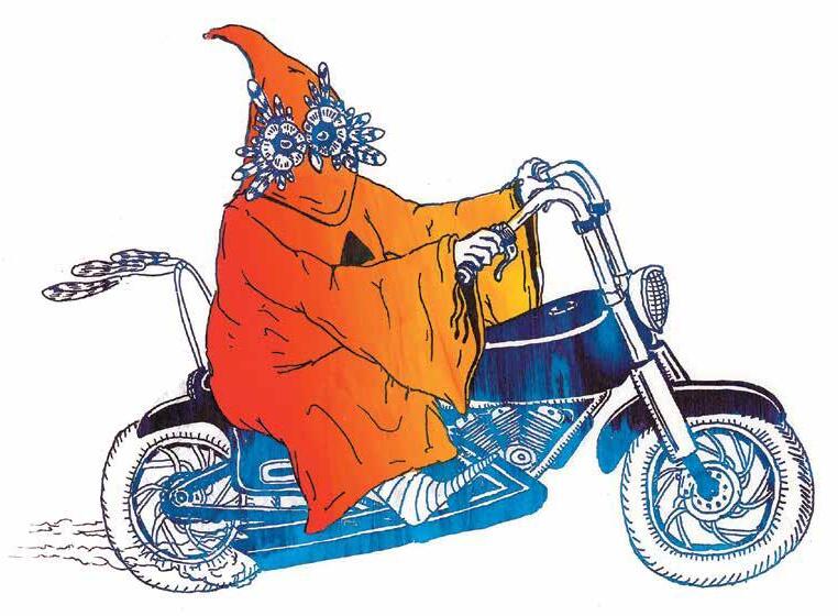 “I’m a 90s kid. I grew up skateboarding and watching cartoons like Ren & Stimpy. So, I’ve always been drawn to anything weird or counterculture. When I saw this documentary about Heaven’s Gate and Jim Jones and all these groups of crazy people that did insane religious things, I came up with my own cult. It’s basically a group of people that dress up like owls, wear hooded robes, and drink our blood because they think it will make them fly — but of course, they just end up falling off a cliff. Then I just kept drawing them doing ridiculous things. Because, as a graphic designer, I’ll obsess on any visual for months. And I’ve never been into art that felt too serious. I’d rather draw something that’s a little bit fun — and a little bit scary.”