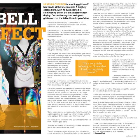 Over the years, the whimsical tutus of girlhood gave way to “Hey girl, your stuff is amaze! Do you have any time to bedazzled, bustier style tops and accompanying fairy wings make something for me for Burning Man?” that accentuate and celebrate the female form. When Overton left It was the heiress herself, Paris home to travel everywhere from Hilton. The model and former Alaska to Thailand, she brought “It’s a very niche reality star — commonly referred her hobby of making fantasy to as the “Kim Kardashian of industry, so I knew that costumes with her. It began the early 2000s” — is now the to grow into a small, mobile I had to completely number-one female DJ in the business with the help of social world. commit.” media marketing and Etsy, the online marketplace for handmade “I absolutely freaked out,” says items. Overton. “I put my phone down, walked straight out the door, and “I would get commissions and I’d be making them in the went for a really long walk. I came back probably an hour or back of trucks, packaging things at a Starbucks, trying to get so later and calmly said, ‘Yeah, of course! What would you them shipped out,” she laughs. like?’” Last March, Overton moved home to commit to her dream of being a “full-time fairy artist.” The work soon consumed her life — and her space — but the heart of it is a single room filled with psychedelic-looking materials. Drawers labeled “sequins,” “feathers,” and “rhinestones.” Yards of iridescent fabrics. Her current favorite is called “vegan holographic leather,” which looks like a piece of silvery vinyl that got dipped in a rainbow. An entire length of wall is hung with an impressive inventory of bra tops, headdresses, and fairy wings — which are her best-selling, signature items. “Some pieces convey compassion, they’re lighthearted,” she explains, pointing to a purple top with an intricate butterfly wing applique. “Other pieces are a little more edgy.” She holds up one covered in what appear to be feathers cut from a metallic gold fabric. Den of iridescence. Photo: Chris Bickford