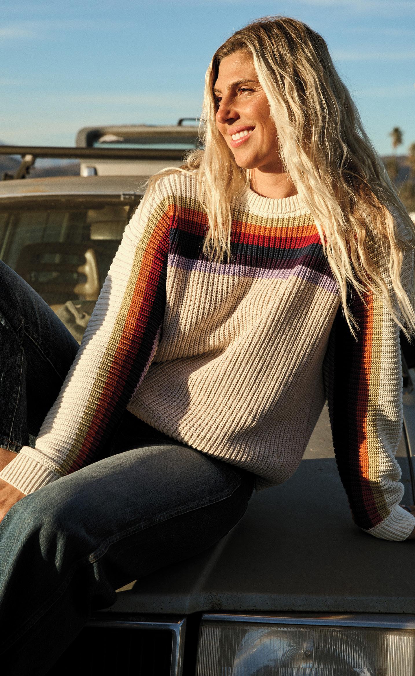 You know our Nostalgic Sweater when you see it; it’s worn like a badge of honor. Those vibrant, retro-inspired rainbow stripes on the sleeves and the softest waffle knit fabric. This is our homage to the golden age of ‘70s board sports, an era we hold close. For the newest addition to our women’s Nostalgic Sweater lineup, we dropped an even more vintage-inspired rainbow sleeve style made with 100% recycled yarns (recycled cotton and recycled polyester) in a loftier 5-gauge half cardigan stitch.