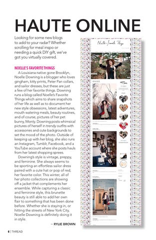 HAUTE ONLINE Looking for some new blogs to add to your radar? Whether scrolling for meal inspo or needing a quick DIY gift, we've got you virtually covered. NOELLE’S FAVORITE THINGS A Louisiana native gone Brooklyn, Noelle Downing is a blogger who loves gingham, kitty prints, Peter Pan collars, and sailor dresses, but these are just a few of her favorite things. Downing runs a blog called Noelle’s Favorite Things which aims to share snapshots of her life as well as to document her new style obsessions, latest adventures, mouth watering meals, beauty routines, and of course, pictures of her pet bunny, Monty. Downing posts whimsical pictures of herself in trendy outfits with accessories and cute backgrounds to set the mood of the photo. Outside of keeping up with her blog, she also runs an Instagram, Tumblr, Facebook, and a YouTube account where she posts hauls from her latest shopping sprees. Downing’s style is vintage, preppy, and feminine. She always seems to be sporting an effortless sailor dress paired with a cute hat or pop of red, her favorite color. This winter, all of her photo collections are showing off a jacket that complements her ensemble. While capturing a classic and feminine style, this brunette beauty is still able to add her own flair to something that has been done before. Whether she is staying in, or hitting the streets of New York City, Noelle Downing is definitely doing it in style. – RYLIE BROWN 4 | THREAD