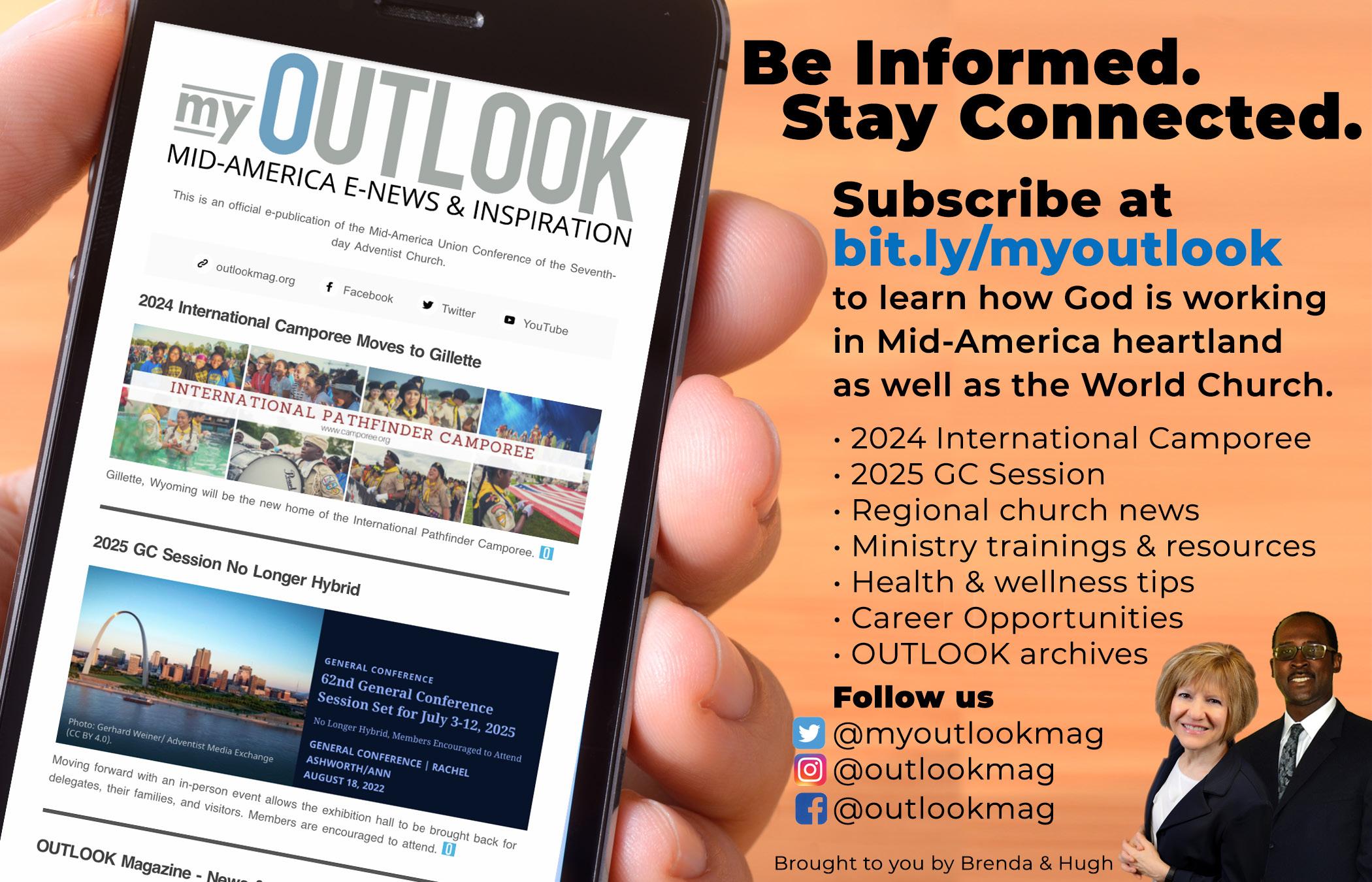OUTLOOK (ISSN 0887-977X) February 2023, Volume 44, Number 2. OUTLOOK is published monthly (10 months per year) by the Mid-America Union Conference of Seventh-day Adventists, 8307 Pine Lake Road, Lincoln, NE 68516. Printed at Pacific Press Publishing Association, Periodical postage paid at Lincoln, NE and additional offices. USPS number 006-245. Postmaster: Send all UAA to CFS. Free for Mid-America church members and $12 per year for subscribers. ©2023 Mid-America Union Conference of Seventhday Adventists. Unless otherwise credited, all images are iStock. Adventist® and Seventh-day Adventist® are registered trademarks of the General Conference of Seventh-day Adventists. CONTACT us by email: info@maucsda.org or phone: 402.484.3000
