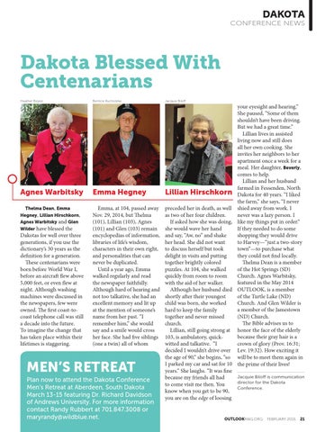 your eyesight and hearing.” She paused, “Some of them shouldn’t have been driving. But we had a great time.” Lillian lives in assisted living now and still does all her own cooking. She invites her neighbors to her apartment once a week for a meal. Her daughter, Beverly, comes to help. Lillian and her husband farmed in Fessenden, North Agnes Warbitsky Emma Hegney Lillian Hirschkorn Dakota for 40 years. “I liked the farm,” she says, “I never Emma, at 104, passed away preceded her in death, as well shied away from work. I Thelma Dean, Emma as two of her four children. never was a lazy person. I Nov. 29, 2014, but Thelma Hegney, Lillian Hirschkorn, If asked how she was doing, like my things put in order.” (101), Lillian (103), Agnes Agnes Warbitsky and Glen If they needed to do some (101) and Glen (103) remain she would wave her hand Wilder have blessed the shopping they would drive encyclopedias of information, and say, “Aw, no” and shake Dakotas for well over three her head. She did not want to Harvey—“just a two-story libraries of life’s wisdom, generations, if you use the town”—to purchase what characters in their own right, to discuss herself but took dictionary’s 30 years as the delight in visits and putting they could not find locally. and personalities that can definition for a generation. together brightly colored Thelma Dean is a member never be duplicated. These centenarians were puzzles. At 104, she walked of the Hot Springs (SD) Until a year ago, Emma born before World War I, Church. Agnes Warbitsky, quickly from room to room walked regularly and read before an aircraft flew above featured in the May 2014 with the aid of her walker. the newspaper faithfully. 5,000 feet, or even flew at Although her husband died OUTLOOK, is a member night. Although washing Although hard of hearing and shortly after their youngest of the Turtle Lake (ND) machines were discussed in not too talkative, she had an child was born, she worked Church. And Glen Wilder is the newspapers, few were excellent memory and lit up a member of the Jamestown hard to keep the family owned. The first coast-toat the mention of someone’s (ND) Church. together and never missed coast telephone call was still name from her past. “I The Bible advises us to church. a decade into the future. remember him,” she would honor the face of the elderly Lillian, still going strong at To imagine the change that say and a smile would cross because their gray hair is a has taken place within their her face. She had five siblings 103, is ambulatory, quickcrown of glory (Prov. 16:31; witted and talkative. “I lifetimes is staggering. (one a twin) all of whom decided I wouldn’t drive over Lev. 19:32). How exciting it the age of 90,” she begins, “so will be to meet them again in I parked my car and sat for 10 the prime of their lives! years.” She laughs. “It was fine Jacquie Biloff is communication because my friends all had Plan now to attend the Dakota Conference director for the Dakota to come visit me then. You Men’s Retreat at Aberdeen, South Dakota Conference. know when you get to be 90, March 13-15 featuring Dr. Richard Davidson you are on the edge of loosing
