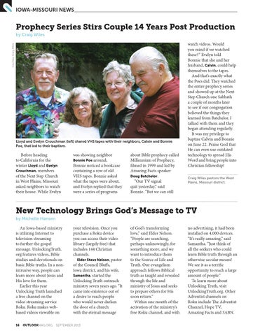 watch videos. Would you mind if we watched these?” Evelyn told Bonnie that she and her husband, Calvin, could help themselves to the tapes. And that’s exactly what the Poes did. They watched the entire prophecy series and showed up at the Next Step Church one Sabbath a couple of months later to see if our congregation believed the things they learned from Batchelor. I talked with them and they began attending regularly. It was my privilege to baptize Calvin and Bonnie on June 22. Praise God that He can even use outdated technology to spread His Word and bring people into Christian fellowship! Craig Wiles pastors the West Plains, Missouri district.