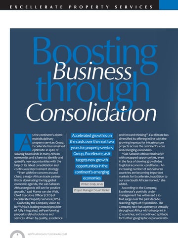 Boosting Business through Consolidation s the continent’s oldest multidisciplinary property services Group, Excellerate has remained optimistic in spite of slowing headwinds in many African economies and is keen to identify and quantify new opportunities with the help of its latest consolidation and continuous improvement strategy. “Even with the concern around China, a major African trade partner that is dominating the big global economic agenda, the sub-Saharan African region is still set for positive growth,” said Marna van der Walt, Chief Executive Officer (CEO) of Excellerate Property Services (EPS). Guided by the Company vision to be “Africa’s leading trusted provider of fully integrated, self-performing property related solutions and services, driven by quality, excellence