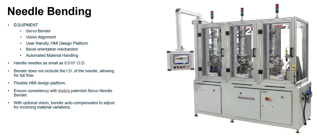 Invioās patented needle bender is capable of bending a drug delivery needle to as small as 1/10,000th of an inch in outside diameter without blocking the drug delivery of the needle. The machine utilizes a highprecision camera and servo motors to ensure the proper needle orientation and position in real-time throughout