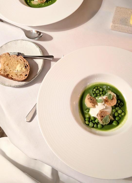 The taste of autumn is encapsulated with a starter of burrata with pea and mint gazpacho. The peas are explosions of freshness, straight out of the pod, and pair perfectly with the deliciously salty Jerusalem artichoke I recognise from the gardens earlier.