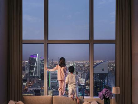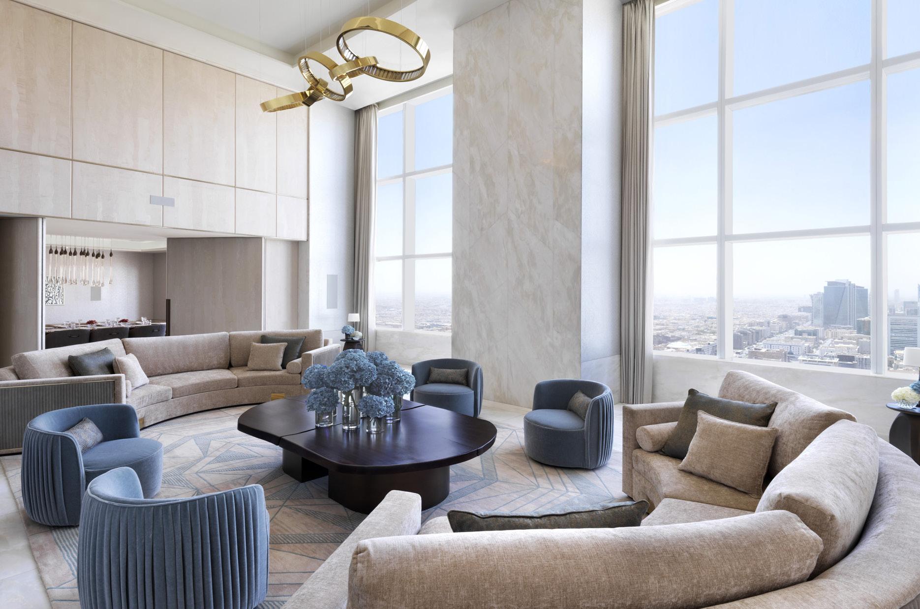 The two spacious suites are palaces in the sky fitted out with indulgent comforts, lavish appointments, contemporary interpretations of historical motifs, and locally produced artworks to create welcoming spaces for family travellers and groups of friends high above the heart of Riyadh.