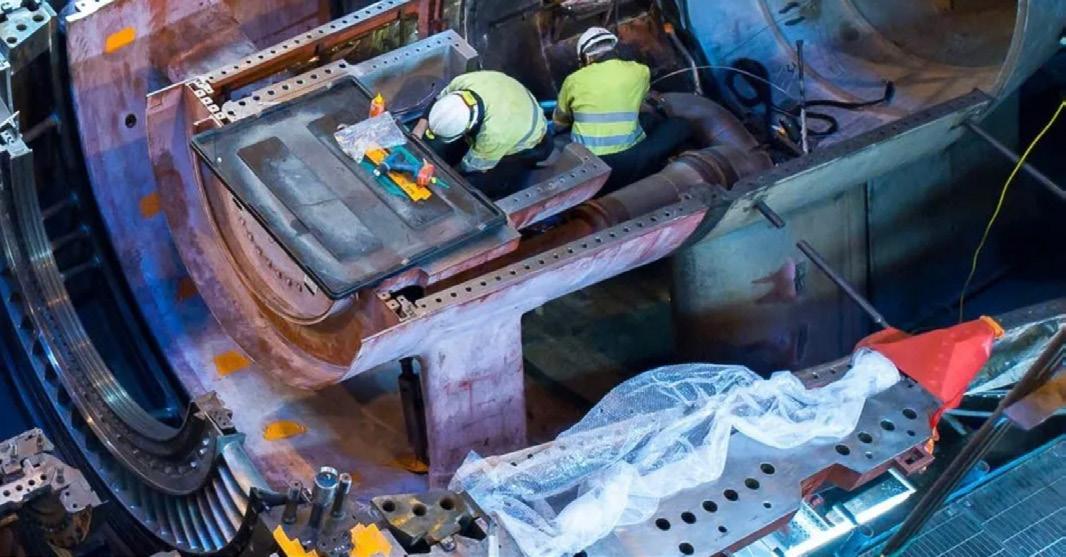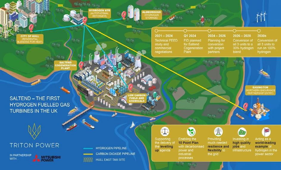 The work Mitsubishi Heavy Industries is doing to burn and blend hydrogen in gas turbines represents the next step in Triton Power’s sevenyear journey to decarbonisation, beginning with the conversion of its Deeside Power Station to a synchronous compensator, in effect an emission-free dampening system for the UK network that functions like a giant flywheel, assisting with fluctuations in the National Grid as a service.