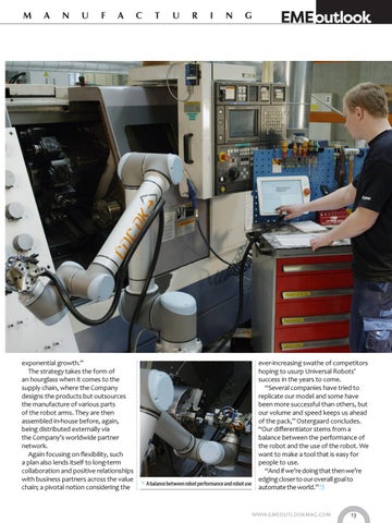 ever-increasing swathe of competitors hoping to usurp Universal Robots’ success in the years to come. “Several companies have tried to replicate our model and some have been more successful than others, but our volume and speed keeps us ahead of the pack,” Ostergaard concludes. “Our differentiator stems from a balance between the performance of the robot and the use of the robot. We want to make a tool that is easy for people to use. “And if we’re doing that then we’re edging closer to our overall goal to automate the world.”