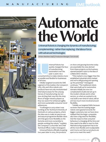 Automate the World Universal Robots is changing the dynamics of manufacturing; complementing - rather than replacing - the labour force with advanced technologies Writer: Matthew Staff | Production Manager: Tom Arnold