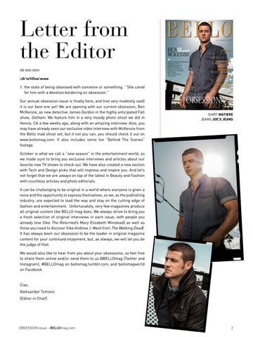 Letter from the Editor ob·ses·sion /əb’seSHən/noun 1. the state of being obsessed with someone or something. “She cared for him with a devotion bordering on obsession.” Our annual obsession issue is finally here, and (not very modestly said) it is our best one yet! We are opening with our current obsession, Ben McKenzie, as new detective James Gordon in the highly anticipated Fall show, Gotham. We feature him in a very moody photo shoot we did in Venice, CA a few weeks ago, along with an amazing interview. Also, you may have already seen our exclusive video interview with McKenzie from the Bello mad shoot set, but if not you can, you should check it out on www.bellomag.com. It also includes some fun “Behind The Scenes” footage.