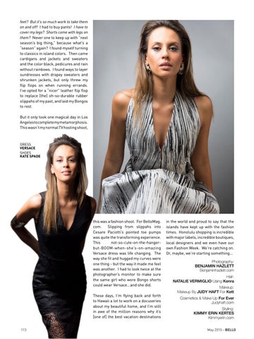 in the world and proud to say that the islands have kept up with the fashion times. Honolulu shopping is incredible with major labels, incredible boutiques, local designers and we even have our own Fashion Week. We’re catching on. Or, maybe, we’re starting something... Photography: BENJAMIN HAZLETT Benjaminhazlett.com Hair: NATALIE VERMIGLIO Using Kenra Makeup: Makeup By JUDY HAFT For Kett Cosmetics & Make Up For Ever Judyhaft.com Styling: KIMMY ERIN KERTES Kimmyerin.com May 2015 - BELLO