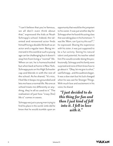 opportunity that would be the jumpstart to his career. It was just another day for Schnapp when he found this acting class that was taking place in his hometown: “I was like ‘Mom, can I just try this out?’,” he expressed. Sharing the experience with his sister, it was just supposed to be a fun activity. Seeing his natural talent and potential, his teacher asked him if he would consider doing this professionally. Schnapp and his family were surprised and none of them knew how to go about it. “Okay, let me give it a shot,” said Schnapp...and the auditions began. It was a slow start but his luck changed when he was cast for Stranger Things. With much love and excitement in his voice, he shared