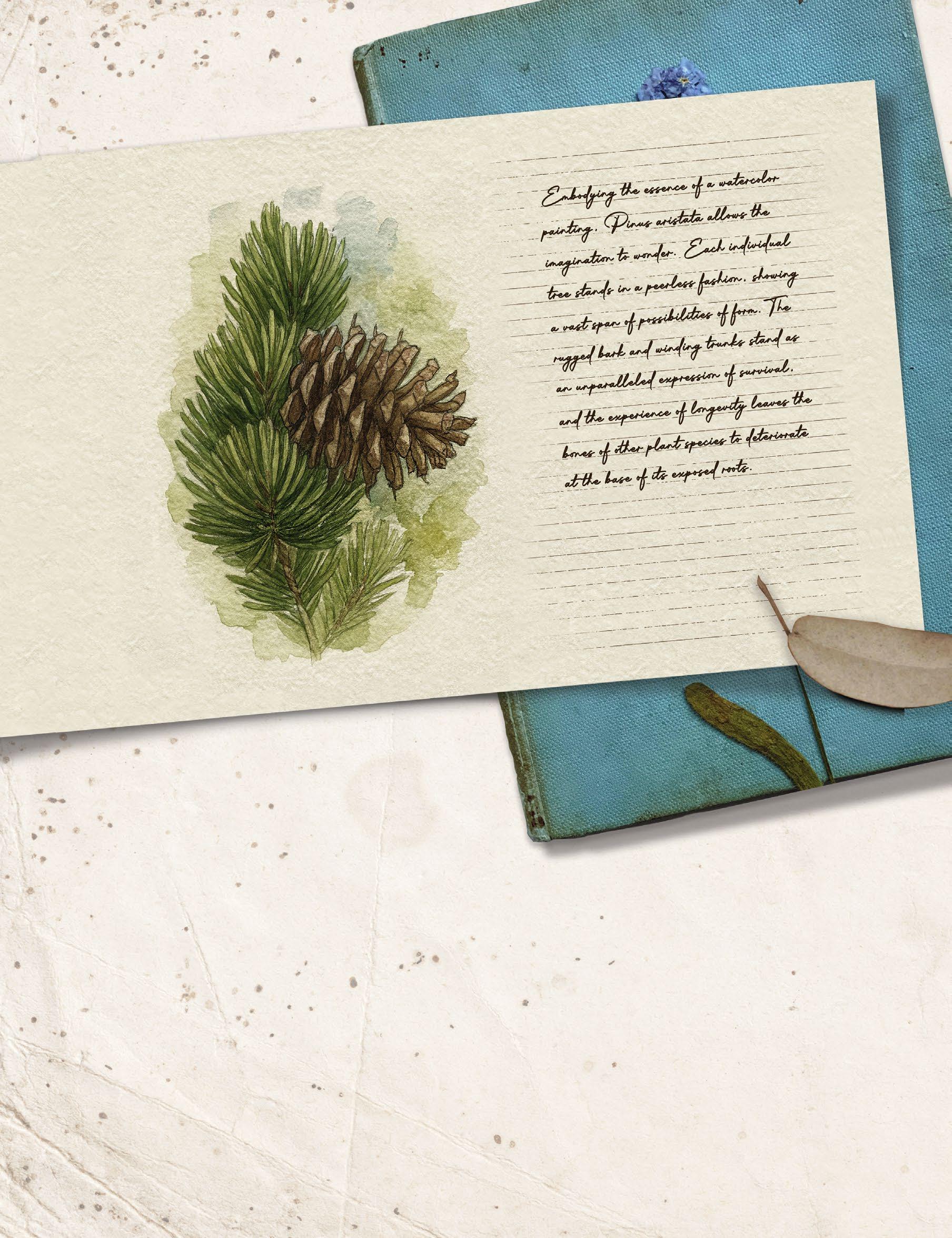 Embodying the essence of a watercolor painting, Pinus aristata allows the imagination to wonder. Each individual tree stands in a peerless fashion, showing a vast span of possibilities of form. The rugged bark and winding trunks stand as an unparalleled expression of survival, and the experience of longevity leaves the bones of other plant species to deteriorate at the base of its exposed roots. These pines bear pollen cones, which are known to blush in tones of red and blue. However, the young seed cones tend to glow with a deep purple, marking them as rare jewels