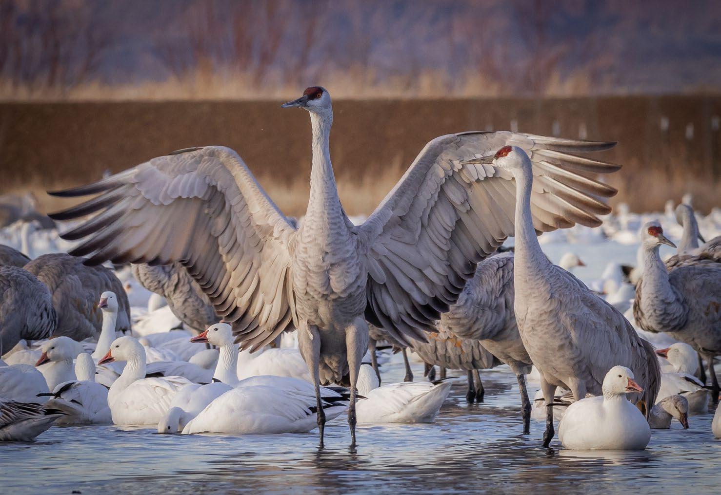 TS: At Bosque del Apache, we mostly welcome birds from the Rocky Mountain population of greater sandhill cranes, but we do also see some lesser sandhill cranes as well. After spending the winter with us, “our” birds migrate up to Montana, Idaho, Canada, and sometimes even up into Alaska to nest. The lesser sandhill cranes migrate through the Midwest and into Ontario, Canada.