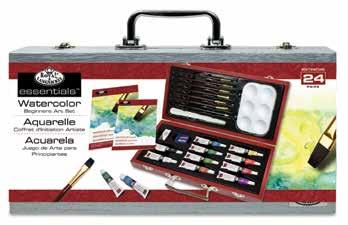12 Watercolor Paint Tubes (12ml), 6 Black Taklon Brushes, Graphite Pencil, Palette, Palette Knife, Drawing Eraser, Sharpener, Wooden Carrying Case.