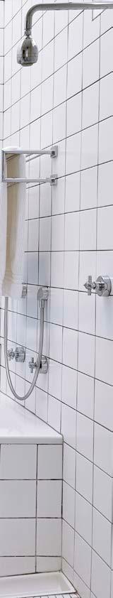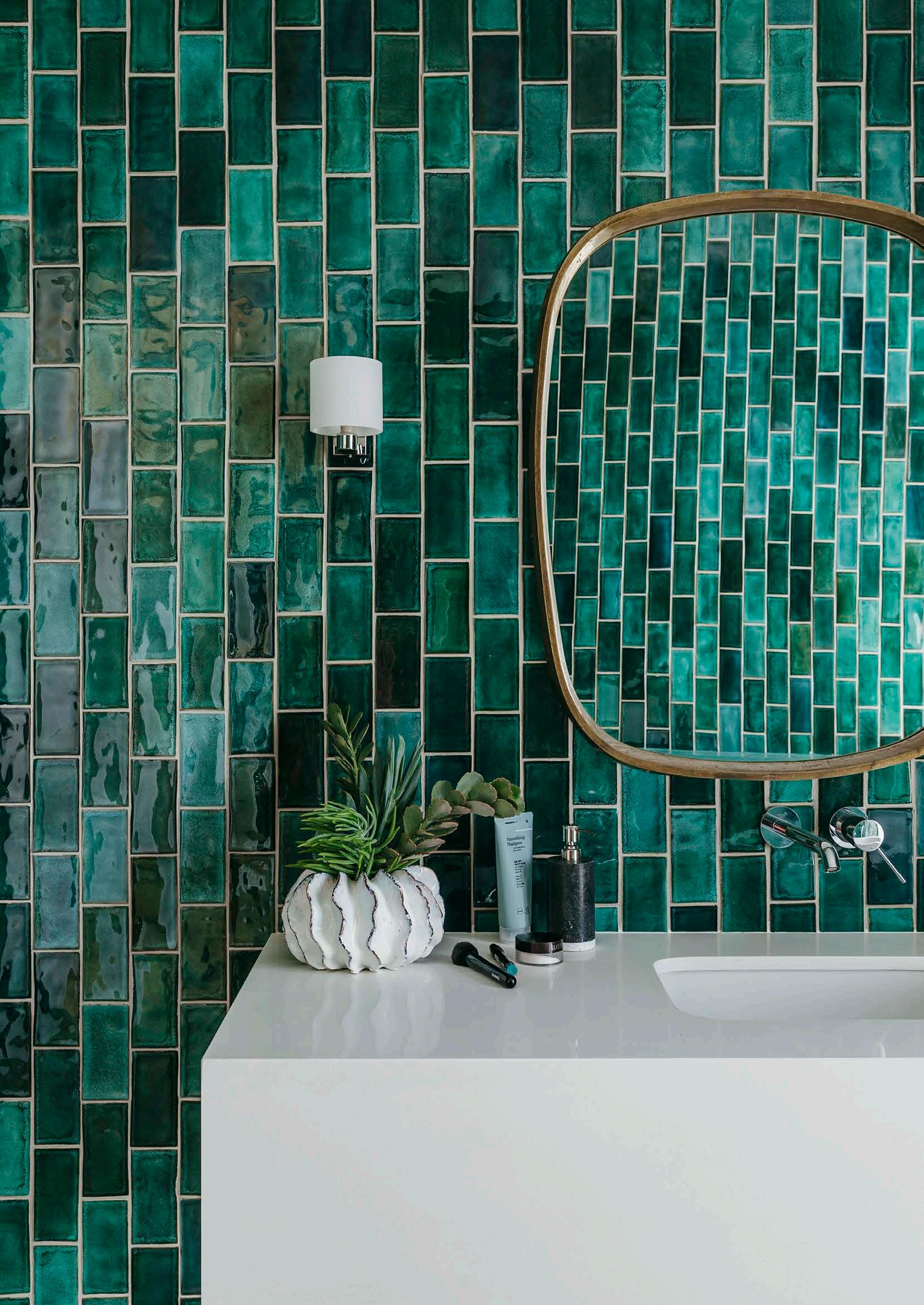 Reminiscent of the gleaming interior of an oldfashioned trinket or jewellery box, the walls of this guest bathroom in a contemporary family home in Durban are clad in handmade glasstoned green tiles from local manufacturers, Southern Art Ceramics. Applied in a vertical broken bond pattern that helps add a feeling of height to the compact space, they give a marvellously luxurious and dramatic atmosphere to the room.