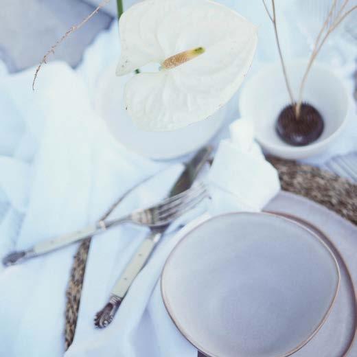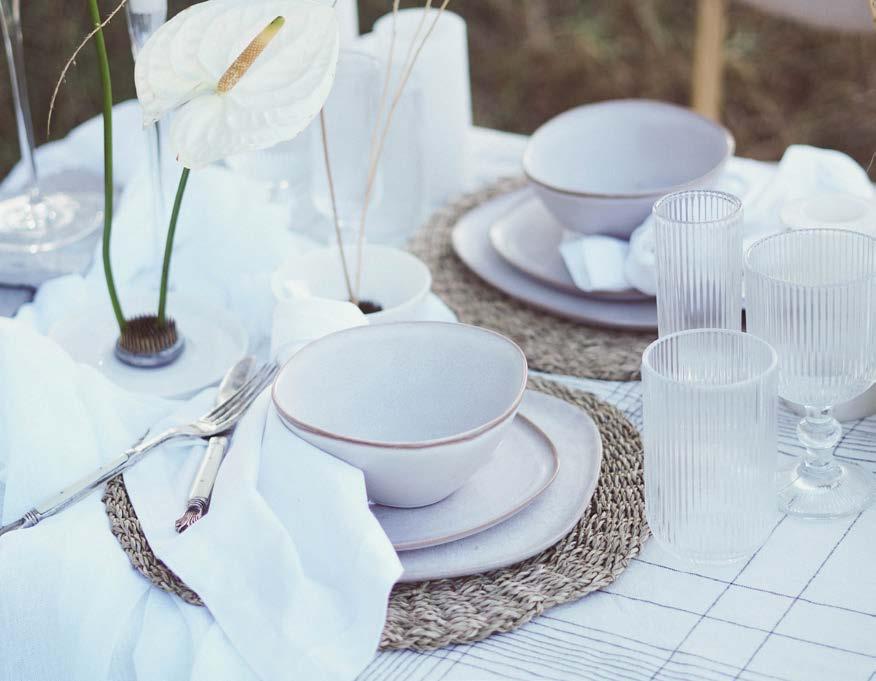 This trend is guided by a pearlescent palette of white, beige, ivory, and cappuccino. The key to creating an ethereal tablescape is to focus on combining a multitude of tex tures. In this setting we paired ceramics with layered raw linen tablecloths and a muslin runner for the base. Add imperfect ceramic crockery with an organic rattan placemat to further heighten the textural intrigue. Style the table with translucent décor elements and glassware, Laguiole-inspired cutlery, and low ceramic bowls to interweave the ikebana-style floralscape.