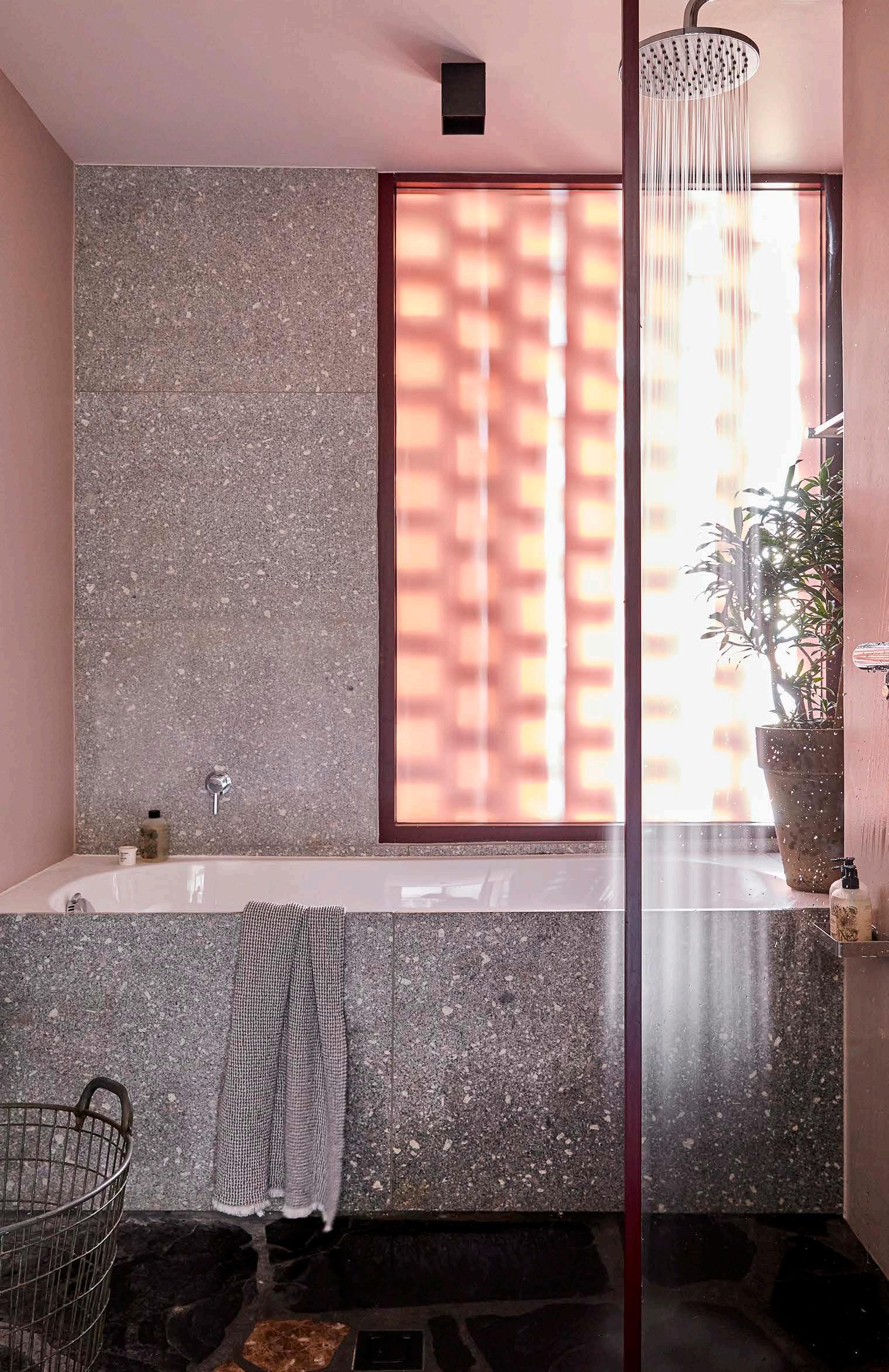 The ongoing appeal of millennial pink – the dusty, off-pastel shade that has been popping up in youthful interiors for years – is amply demonstrated in this bathroom, which forms part of a newly built apartment with a stylish, retro feel. The chunky granite cladding on the bath and charcoal-grey slate tiles on the floor of this 'wet room' space offer a practical way to ground and offset the soft pink shade on the walls.