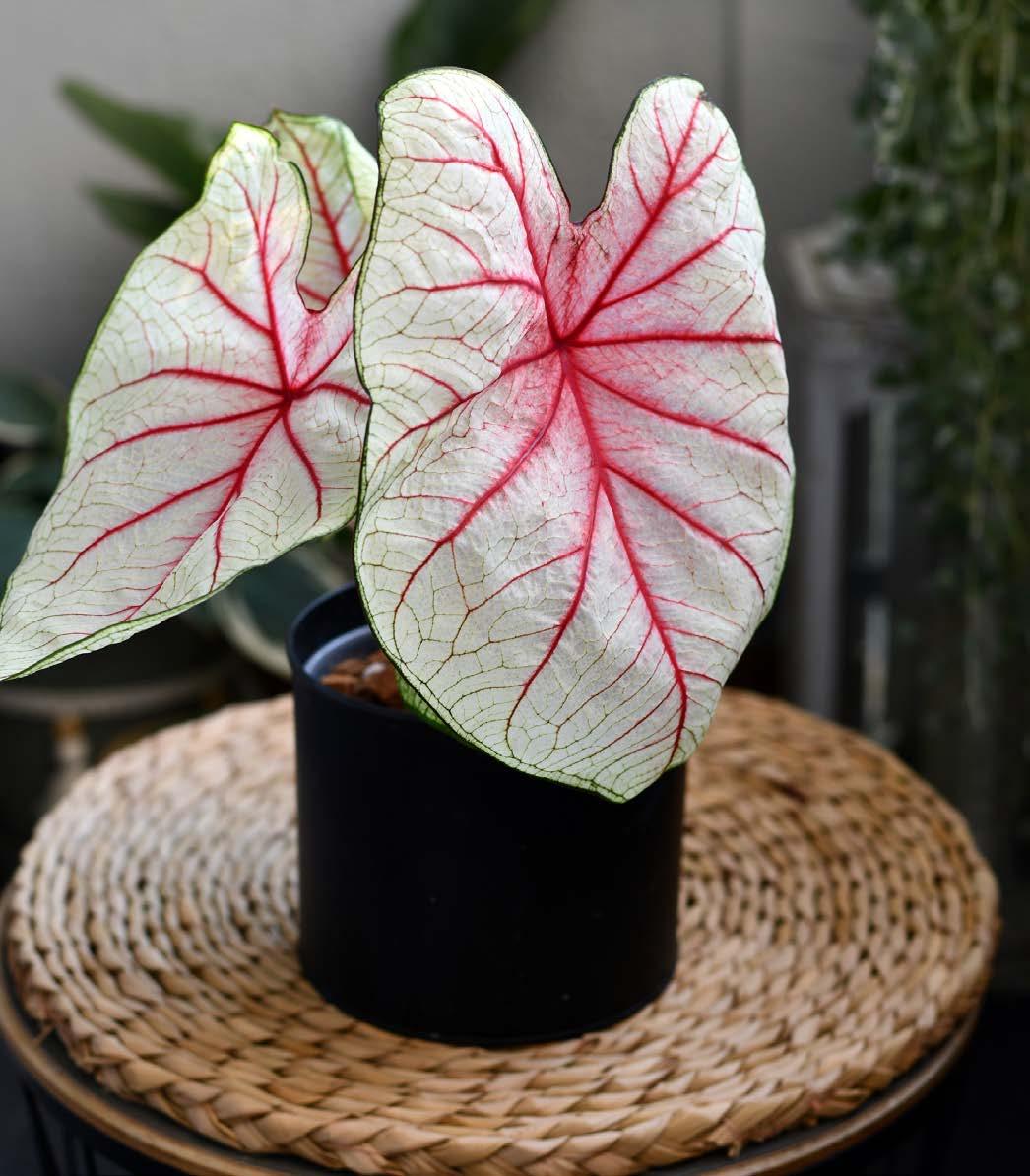 Caladium is a genus of flowering plants also known by its beautiful common names ‘Elephant Ear’, ‘Heart of Jesus’, and ‘Angel Wings’. Although traditionally used for shady outdoor gardening, Caladiums are slowly becoming the new indoor cool kid on the block. Their large lush leaves come in a wide array of colours and patterns, giving one the feeling of collecting a rare art piece. Caladiums are also a great substitute for having fresh flowers in the home, albeit longer-lasting. Their beautiful foliage with splashes of green, white, pink, or red is simply irresistible.