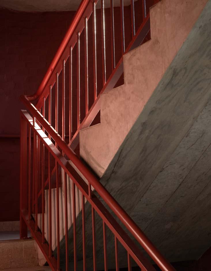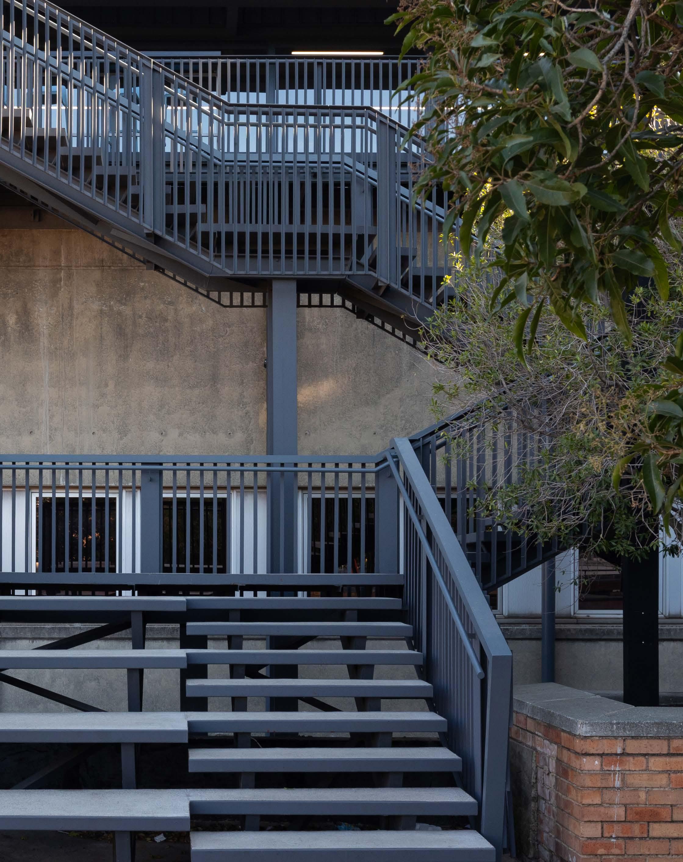 The stairs are not only entry points to the new building — they’re conduits between the open courtyard and the balcony, creating multiple fluid connections to the existing building and open-air green space. Designed with a sculptural quality and fine steel detailing, the staircase allows generous movement and invites social encounters through its built-in seating. The exterior fireescape staircases are celebrated and integrated with everyday circulation.