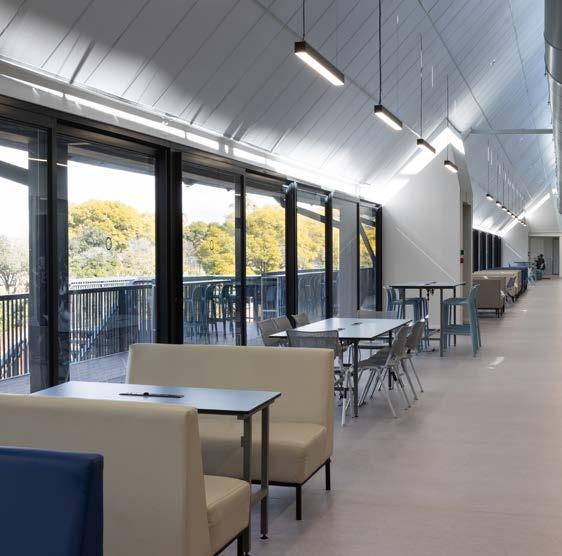 The glazed concourse, naturally lit through a clerestory strip window, celebrates light in an environment where interior spaces were previously dimly lit. The atrium evokes this sense of lightness induced by the building’s new form too: sitting on a bulky existing concrete structure, the L-shaped atrium aligns with the balcony, sharing the same views and social connectivity brought by visual connections and layering. The porosity of the new additions shows the transformed attitude to educational spaces that welcomes, rather than alienates.