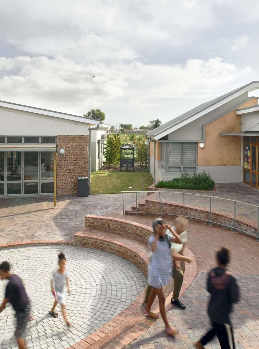 The centre’s internal palette of geometric linoleum, warm carpets, glossy steelwork, natural plywood, and colourful furniture is a bold expression aligning with the rich curriculum. This material choice adds to a spatial sequence that is equally engaging and functional. Diverse learning environments are connected by dynamic flooring and steel balustrades that guide movement through the building. With linoleum flooring and plywood contributing to a low-impact materials palette, the building is a model of sustainability. Openings are strategically shaded and oriented, maximising natural light and encouraging cross ventilation. The centre even generates its own energy.