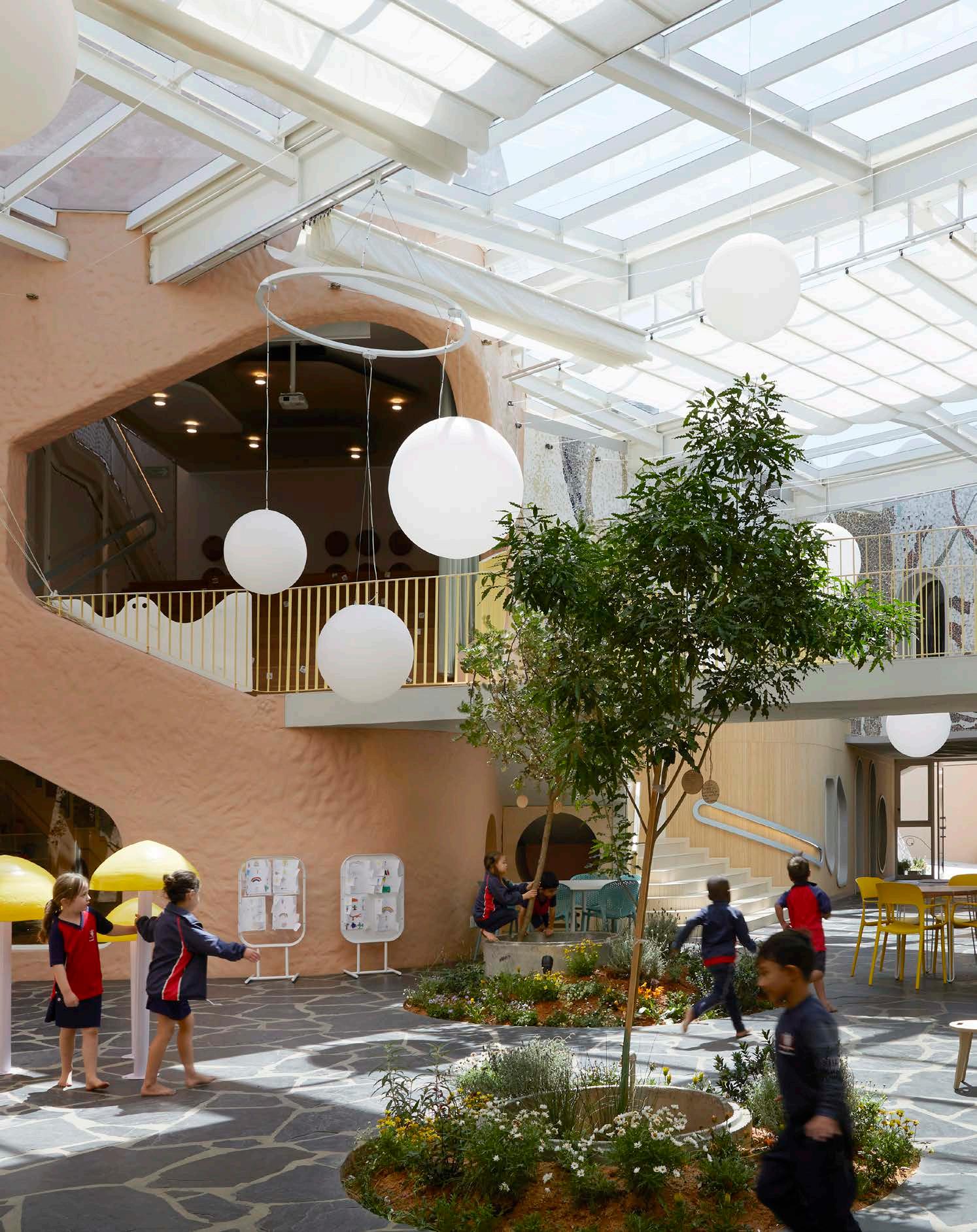 The school's interconnected design — merging a maker space, computer lab, performance area, and library — supports a dynamic curriculum promoting curiosity and movement.