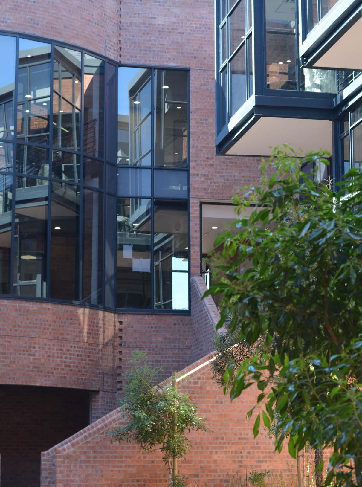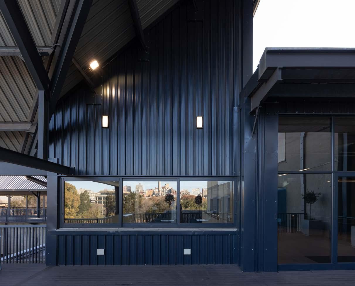 patch of outdoor recreation space. The new structure’s steep, angled roof positions this open space as an entry threshold and courtyard: its angled edges frame the area as a sheltered oasis. Shaped and raised, the structure houses an open-air study and leisure space. From the concourse and cantilevered balconies, students now have 180-degree views of Johannesburg’s impressive city skyline.