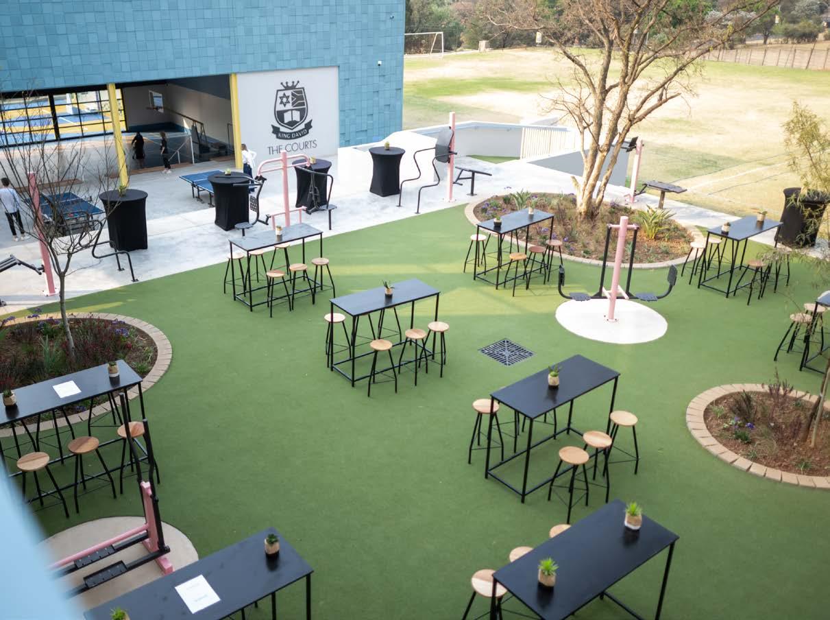 The entire facility is designed to maximise flexibility and function while encouraging visibility and interaction. A café with a viewing deck offers a fantastic vantage point for watching rugby games or simply enjoying the surrounding activities. The building itself is punctuated by bold, vibrant colours, with the King David blue accentuating 1 400 square metres of plasterwork — crafted by a skilled local artisan. The vibrant exterior gives the structure a dynamic, energetic presence and a feeling of movement.
