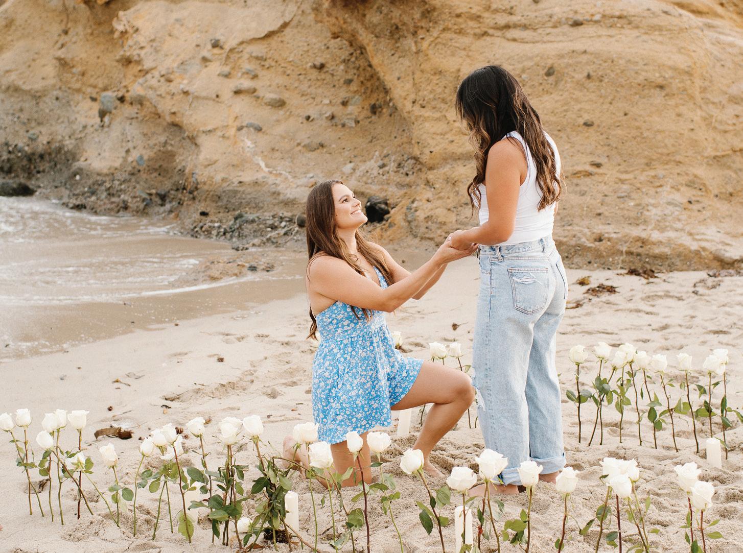 Not to be outdone, Cortney planned her own proposal just weeks later during an engagement photo shoot in Laguna Beach. With flowers, candles, and a bit of behind-thescenes coordination with the photographer, she surprised Hannah in return.