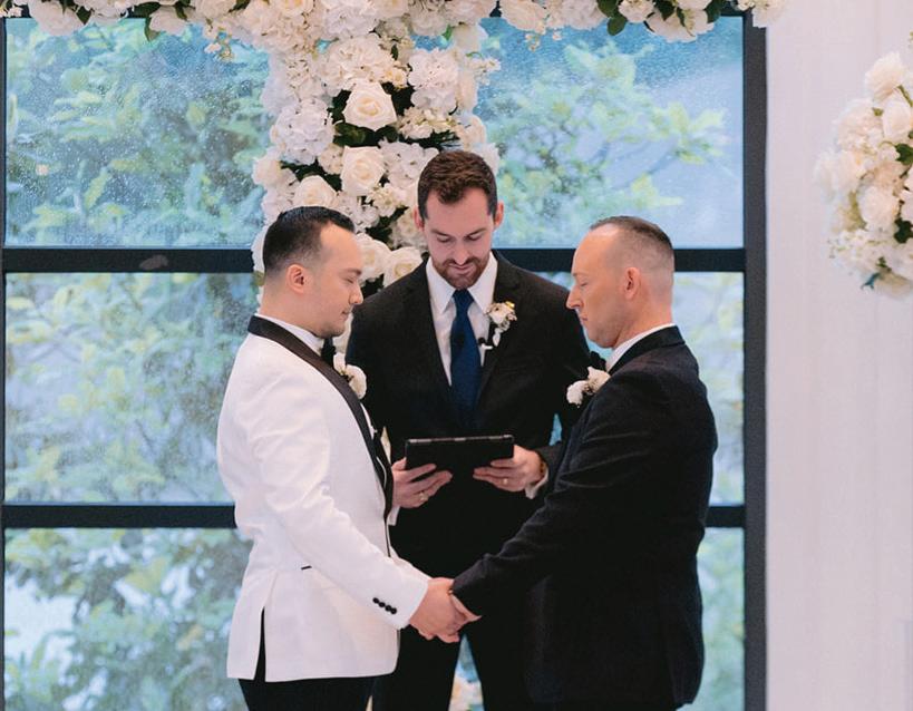 The couple also offers praise for their wedding officiant Luke Oaks of Officially Oaks, Mychelle Bang of Blush Floral Company, and Houston’s own Miss Gay America Dessie LoveBlake, who performed a Taylor Swift medley and a P!nk medley, complete with backup dancers, during the reception.