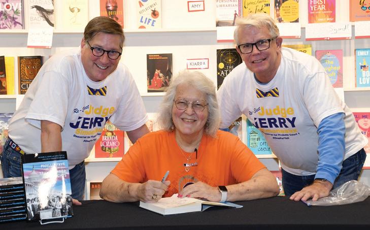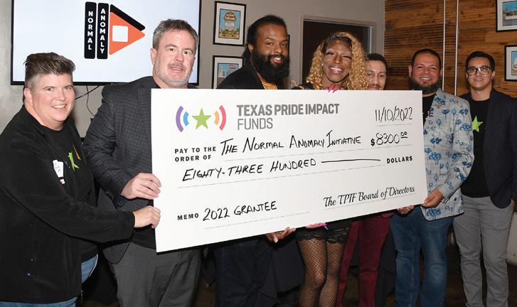 On November 10, 2022, Texas Pride Impact Funds hosted its five-year anniversary reception and check presentation at Harold’s Restaurant. Pictured are Lisa Madry, Bryan Hlavinka, Jordan Edwards, Joelle Espeut, Hector Ruiz, Robert Salcido Jr., and Petey Makopoulos-Senftleber. On October 29, 2022, Phyllis Frye held a Brazos Bookstore signing event for the newly published biography Phyllis Frye and the Fight for Transgender Rights. Pictured are Jerry Simoneaux, Phyllis Frye, and Christopher Bown.