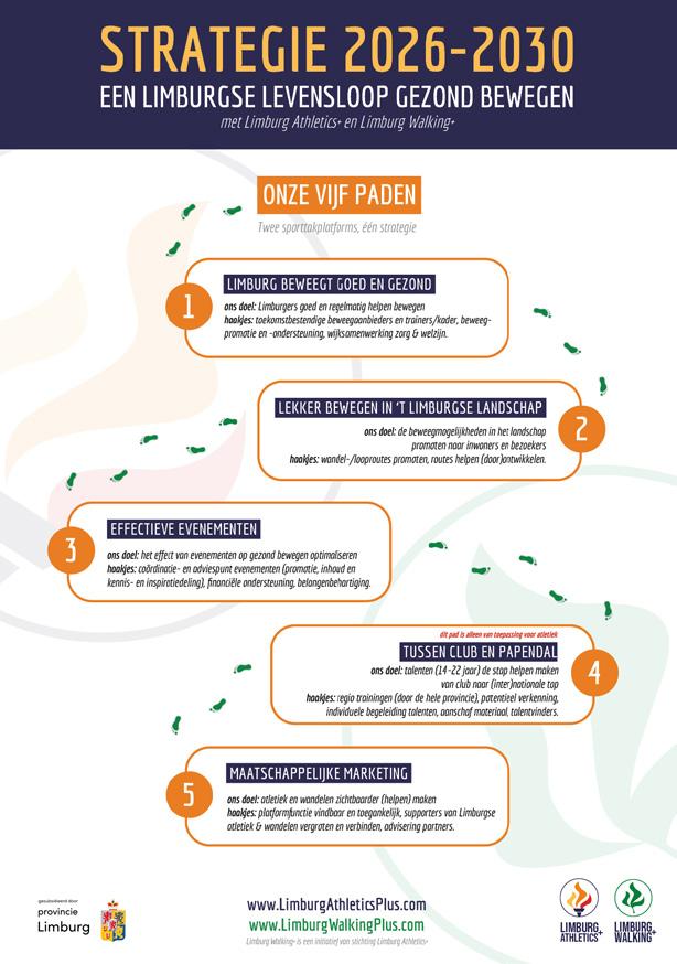 In 2025 ontwikkelden we samen met diverse partners een nieuwe strategie voor de periode 2026-2030: “Een Limburgse levensloop gezond bewegen”, zie bijlage 4. Uit alle gesprekken konden we concluderen dat de basis (onze strategie 2021-2025: “Limburg beleeft en presteert met de moeder der sporten”) nog dusdanig goed staat en bruikbaar is voor de komende periode, dat de nieuwe strategie 2026-2030 vooral als een aanvullende en meer gefocuste (dus niet vervangende) koers voor de komende periode gezien moet worden. Een andere conclusie die we konden trekken, is dat één (gecombineerde) strategie voor atletiek en wandelen een logische en krachtige werkwijze is voor de komende jaren. We danken alle mensen die een rol hebben gespeeld in de totstandkoming van ons nieuwe strategische kompas!