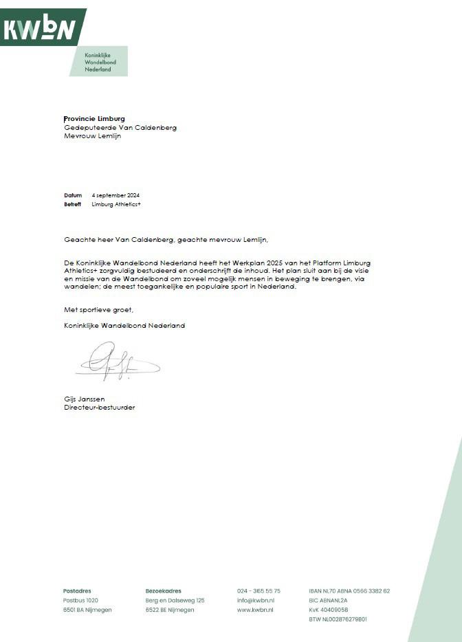 Aangezien Limburg Walking+ geen ambities heeft op het gebied van talent, is er ook geen verplichting van toepassing voor goedkeuring van de TC van de sportbond op het werkplan. Volledigheidshalve voegen wij wel de steunbetuiging toe van de Koninklijke Wandelbond Nederland bij de oprichting van ons platform.