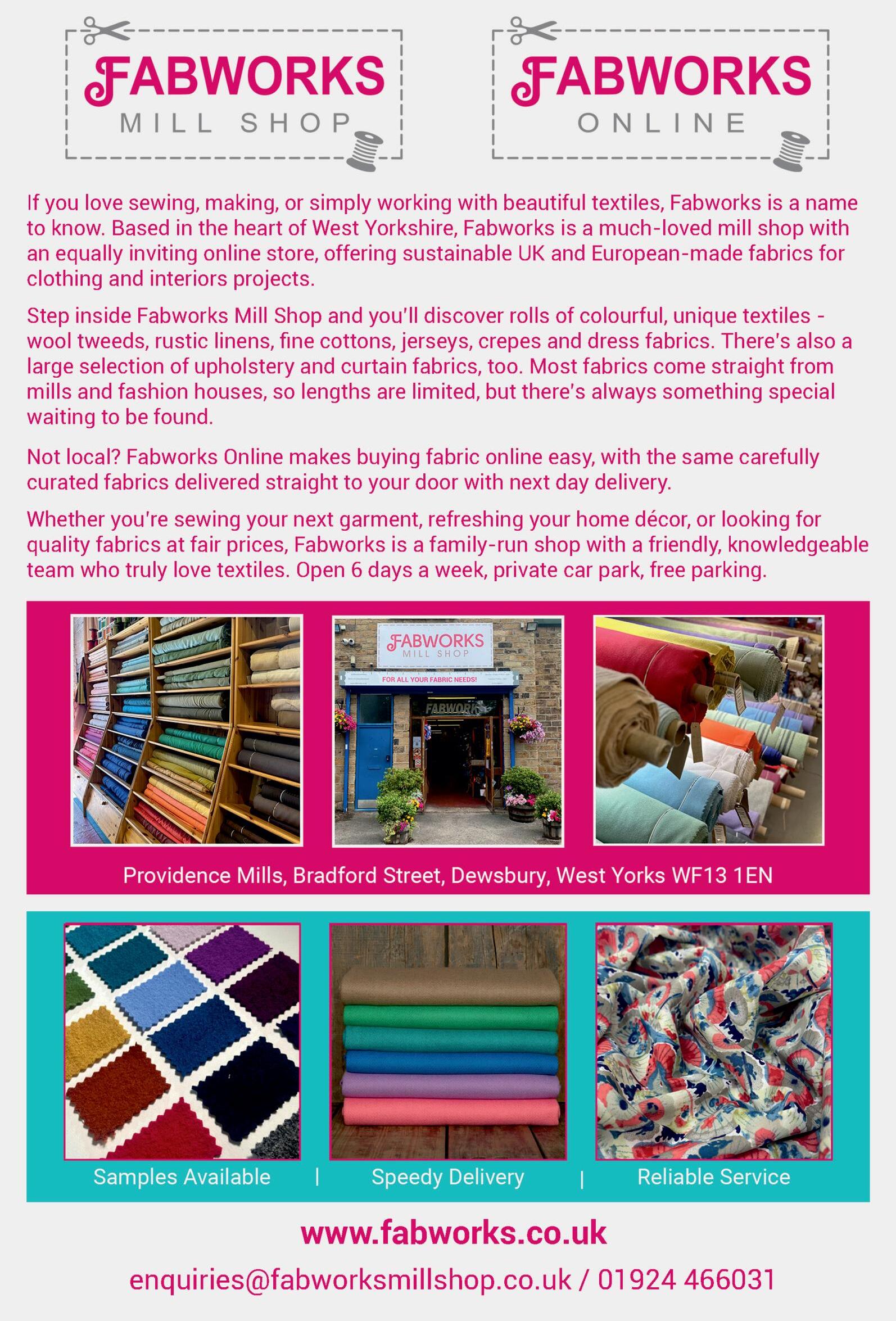 For all the sewing enthusiasts among you we have Fabworks Mill Shop on page 17. They have some amazing fabric and the staff are super friendly and very helpful. I hope you will take a look and maybe explore the creative you!