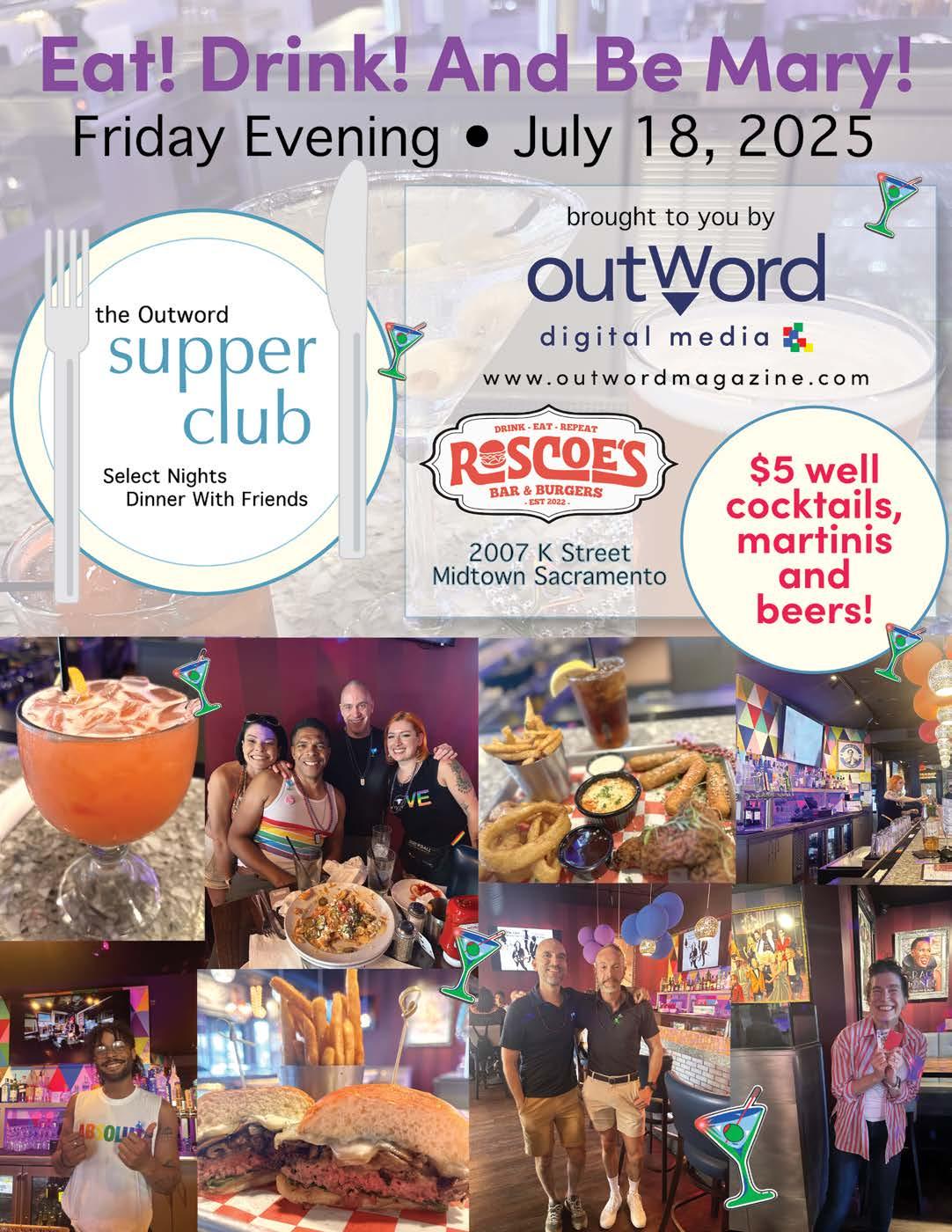 Join Outword Magazine for the Outword Supper Club on Friday, July 18, at Roscoe’s Bar & Burgers, 2007 K St., with seatings at 5 and 6 p.m. Enjoy $5 martinis, craft cocktails, and bold bites in the heart of Midtown. It’s more than dinner—it’s a celebration of community, connection and fabulous Friday night vibes. For more info click here