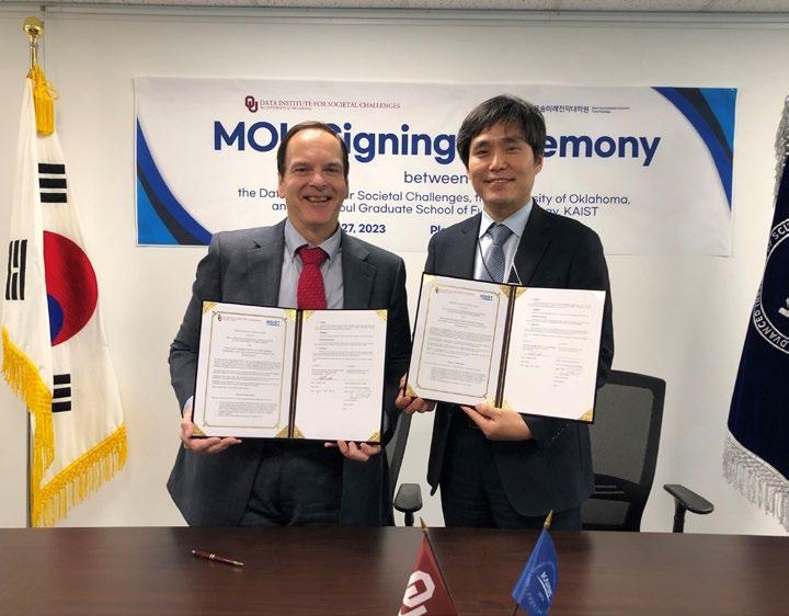The University of Oklahoma and two South Korean institutes have signed memorandums of understanding to facilitate collaborative research to solve societal challenges in data science, data-enabled science, public policy and strategic communication, and to develop data science informed policy intervention for Asia-specific and global problems. These agreements bring together faculty and student researchers from OU, coordinated by DISC, with those from the Moon Soul Graduate School of Future Strategy at the Korea Advanced Institute of Science and Technology (KAIST) and Sejong University.