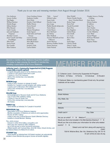 Acknowledgement in Resource Guide and Art Focus Oklahoma Copy of each OVAC exhibition catalog 2 tickets to Tulsa Art Studio Tour $100 of this membership is tax deductible. All of below