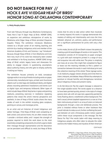 In Do Not Dance for Pay the urgent message is reduced to five single-syllable words. The words appear at a distance to have been painted quickly, almost in the style of vintage grocery store ads with all-caps text, apparently painted by hand, floating above a weathered surface background. The text’s casual, almost slapdash appearance is a ruse as it has been meticulously printed in an array of colors on textured backgrounds through a slow and deliberate process. The print is installed without frame or other hardware that would indicate its status as art, further conflating the pushpull between art and a throwaway public notice. Layered within these visual components is the message, “Do Not Dance For Pay”—five words laden with deep meaning to Indigenous people, who often labor to educate the wider world to the hidden history and injustice of their American CONTINUED