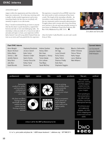 No experience is required to be an OVAC intern but the intern needs to work a minimum of four hours a week. The length of the internship is flexible. An internship is most beneficial for those interested in the arts community and/or non-profit administration. To apply, please send a resume and a letter describing your interests in the arts and some possible interests in your future to: Oklahoma Visual Arts Coalition, PO Box 1946, Oklahoma City, OK 73101. n Erin Latham and Tommy Ball