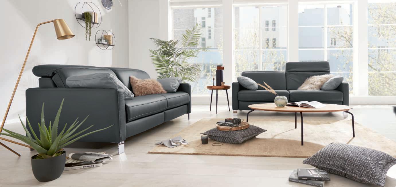 Interliving Sofa Serie 4054, Bezug Leder Longlife Credo anthrazit, Metallfuß chromfarbig, best. aus: 3-Sitzer und 2,5-Sitzer, Rücken Spannstoff, inklusive Kopfteilverstellung an allen Elementen. Ohne Armlehn- und Zierkissen. M907914 208 253 6171 1| 3-Sitzer, ca. B206/H82-104/T104 cm. 2| 2,5-Sitzer, ca. B176/H82-104/T104 cm