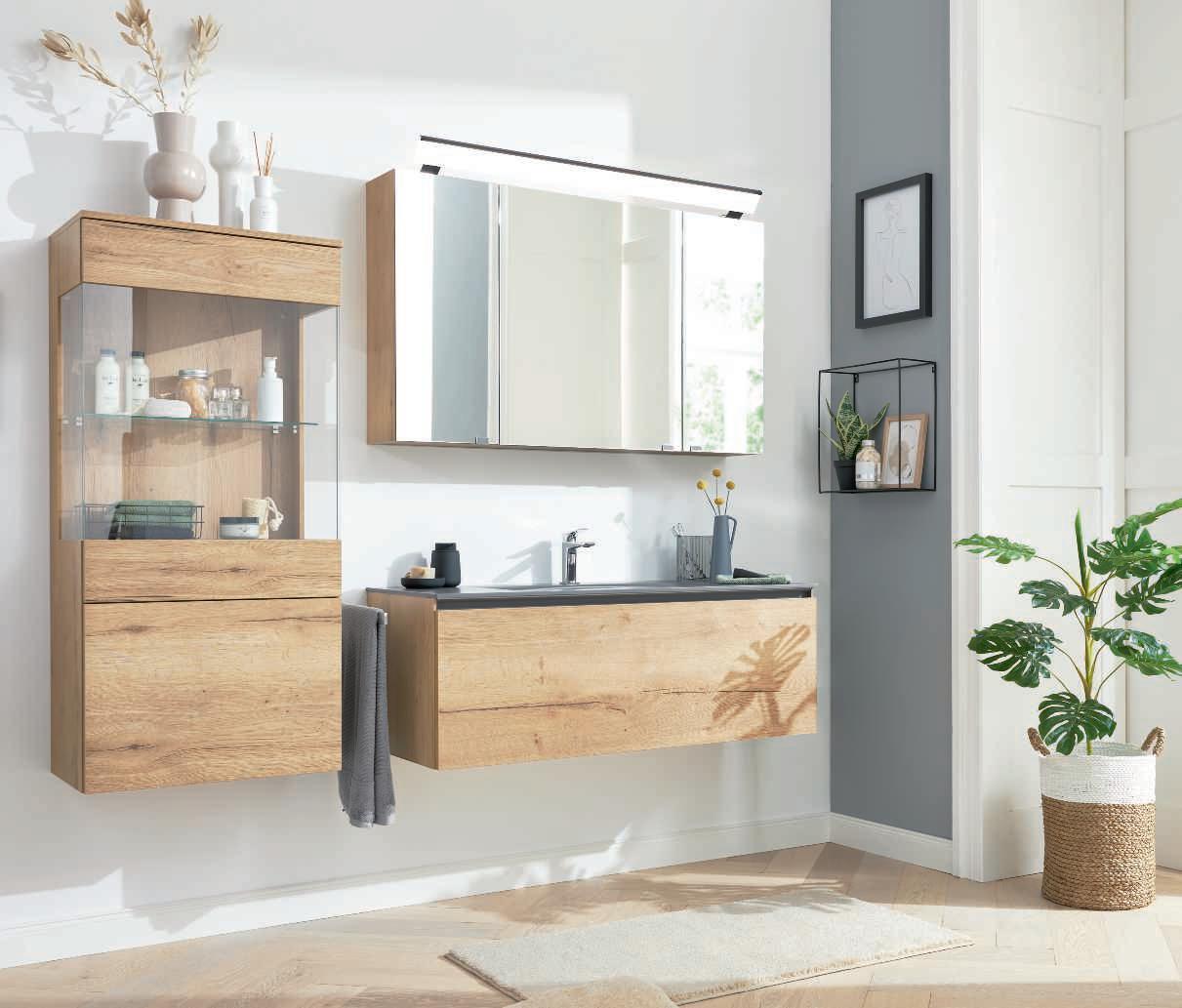 Interliving Bad Serie 7405 - Badkombination, Front und Korpus Eiche Sierra Nachbildung, best. aus Spiegelschrank, 3-trg. mit LED-Aufsatzleuchte, ca. B120/H72/T21 cm, WaschtischUnterschrank, ca. B120/H43/T46 cm, inkl. einem Handtuchhalter, grau mattem Waschtisch und Armatur, Seitenschrank mit offenem Glasvitrinenfach, ca. B60/H130/T35 cm. Preis inkl. Armatur und LED-Beleuchtung. Diese Leuchte enthält eingebaute LED-Lampen der Energieeffizienzklasse G (Spektrum A bis G). Die LEDs können nicht ausgetauscht werden. M983032 216 360 7230 3199.-