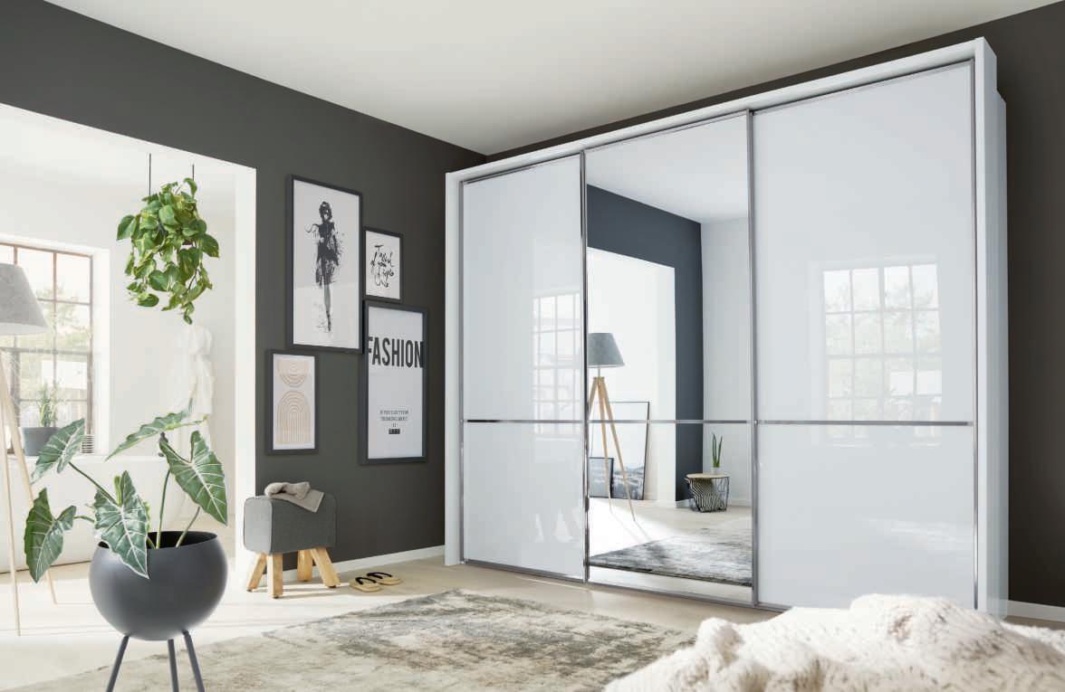 2| Interliving Kleiderschrank Serie 1205 - Schwebetürenschrank, 3-trg., inklusive Passepartout, Außentüren Glas weiß, Mitteltür Kristallspiegel, Griff- und Querleisten chrom, ca. B310/H221/T69 cm. M950401 205 252 6320