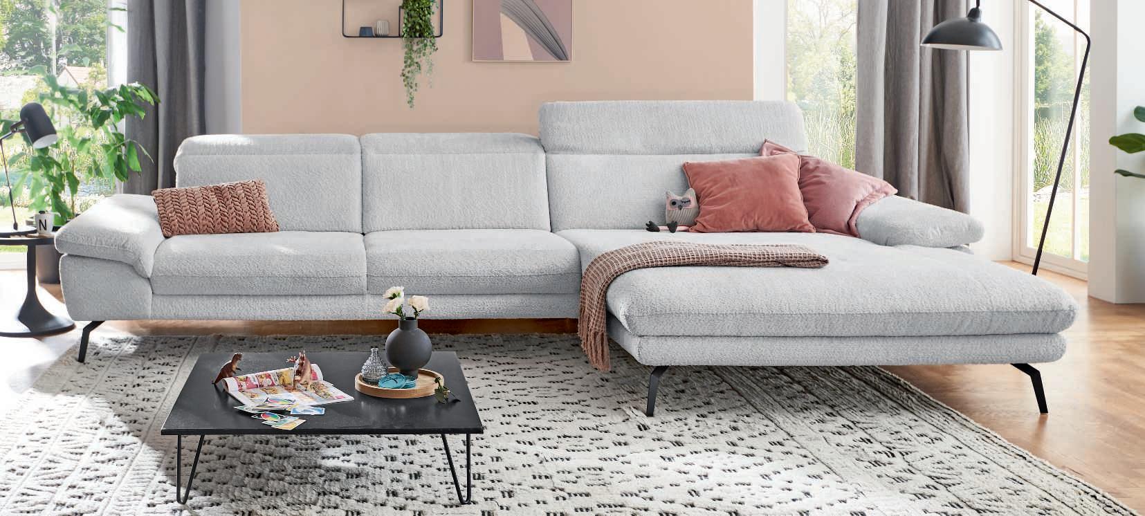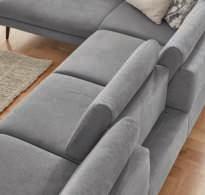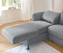 Eckkombination MM-MP1171, Bezug Stoff Kama silver, Metallfuß schwarz, best. aus 3-Sitzer mit Armteil links und XL-Canapé mit Armteil rechts. Inkl. Kopfteilverstellung an allen Elementen. Stellmaß