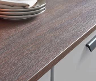 Die Nischenverkleidung im Farbton Stripewood taupe schafft einen harmonischen Übergang zum Wohnbereich.
